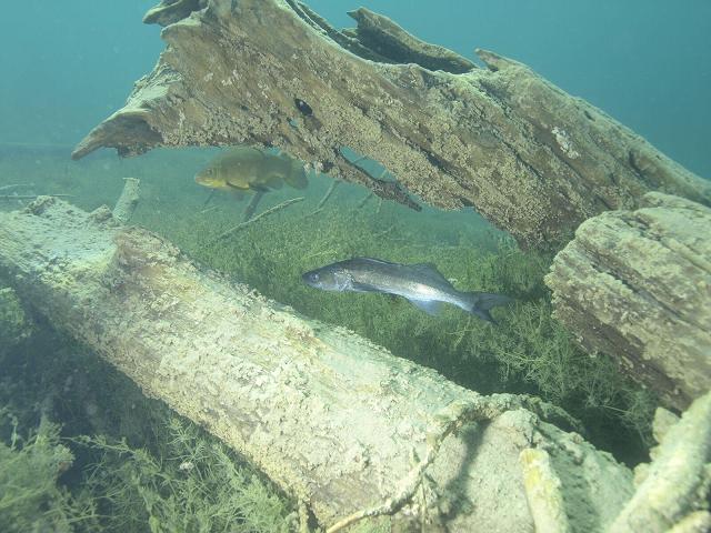 Die Baumstämme liegen heute ähnlich wie beim Mikado verschachtelt im Wasser. Je nach Sichtweite kann man dies als Panorama wahrnehmen oder auch von Gebilde zu Gebilde tauchen. An vielen Stellen liegen die Bäume so, dass man unter ihnen hindurchtauchen kann. Gerade in diesem Bereich ist der Fischreichtum sehr hoch, die Fische fühlen sich zwischen den Stämmen wohl.